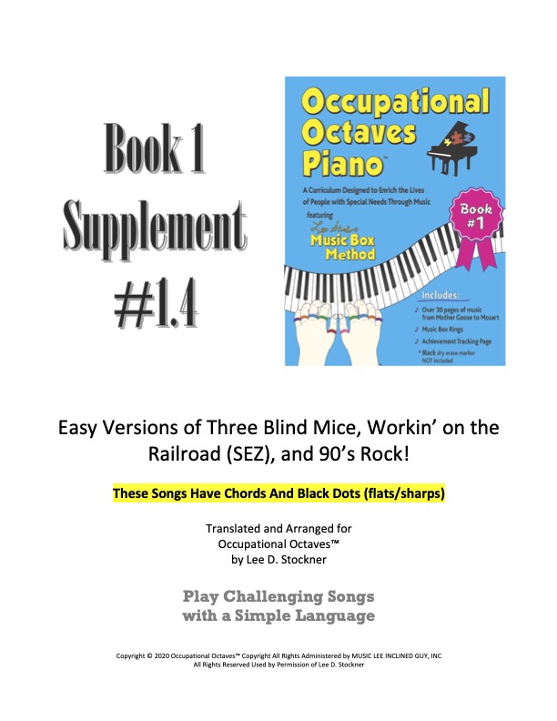 Supplement 1.4 features easy Occupational Octaves™ arrangements of Three Blind Mice, Workin’ on the Railroad, and the original piece 90’s Rock. These versions introduce both chords and black-dot accidentals, helping students progress beyond SEZ/EZ materials while still using clear color-letter notation and structured rhythmic boxes.